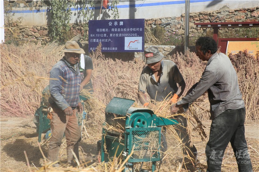 金秋的陽光熾熱溫暖,得榮縣白松鎮(zhèn)奪松村一片祥和安寧。11月10日,村民們正在村活動室的院壩里脫粒藜麥,豐收的喜悅寫在忙碌的村民的臉上?!按蠹壹佑透?,把藜麥交給公司,立馬可以拿到現(xiàn)錢。”奪松村委會副主任四郎都遷高興地說,盤點收成,今年又是一個豐收年。
