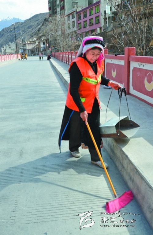 由于丹巴縣城素有風城之稱,五條山谷的風仿佛都聚集在了志瑪大姐負責的濱河路上,風的匯聚也成了垃圾的集中點,當時在分配工區(qū)時,許多清潔工都唯恐這段路落在自己頭上,可志瑪大姐卻主動承擔起這段路面的清潔任務(wù),每天其他清潔工人還在睡夢中時,她就早早的起床,開始一天的工作。烈日當空時,別人都躲在家里乘涼時,志瑪大姐還在路段上來回的巡視,時刻保持路面的清潔。冬日來臨寒風呼嘯,城市里的人們都蜷縮在蝸居里開著空調(diào)、電暖氣等,享受著天倫之樂時,志瑪大姐卻穿著厚厚的冬裝,戴著手套在濱河路上費力的掃著地,她從來沒有叫過一聲苦,有人勸她放棄這段路,她總是笑著說:“國家給了我工資,我就要好好的干,再說城市如果沒有我們這些清潔工,那市民將會生活在臟亂差的環(huán)境里,將有損丹巴這座美麗小城鎮(zhèn)的形象。”