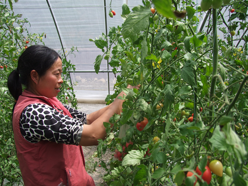 “盛煌公司來這里開展蔬菜大棚建設以后,每畝每年按照1500元的標準支付了村民的土地流轉(zhuǎn)租金。我是外地嫁到這里來的,沒有土地,他們雇傭我來務工,每個月按照1800元支付我的工資,每個月還可以休息兩天。”正在大棚里摘水果番茄的村民陳國蓉知足地說。
