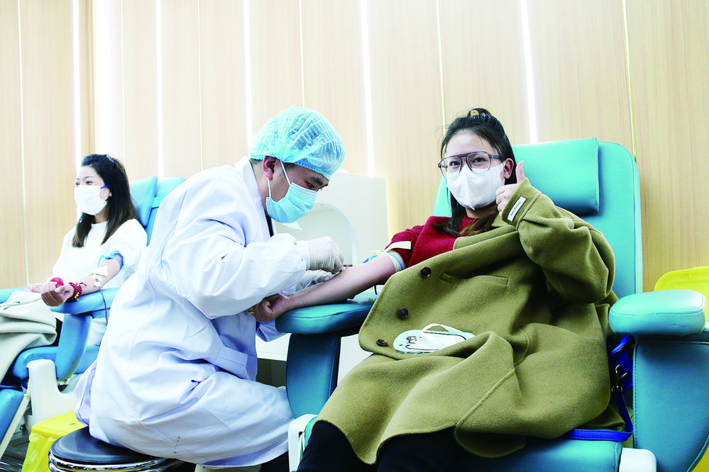 圖為康定市民李女士為災區(qū)傷員獻血。