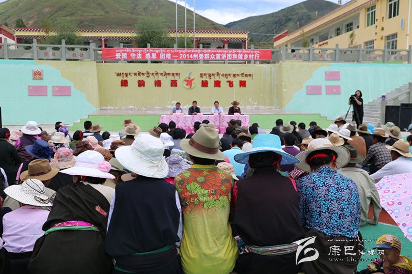 “2014州委群眾宣講團和諧鄉(xiāng)村行”宣講團9月11日下午來到道孚縣格西鄉(xiāng),在格西鄉(xiāng)中心校內(nèi),群眾們早早到來,盤腿坐在塑膠跑道上,認真聽州民干校高級講師仁志降澤用藏文講述的一個又一個通俗易懂的小故事,感知“愛國 守法 感恩 團結”八個字。他還結合具體實例講述法律、交通方面知識,大家聽得聚精會神,時而被降澤老師的小故事逗的捧腹大笑,時而陷入了深深的思考。