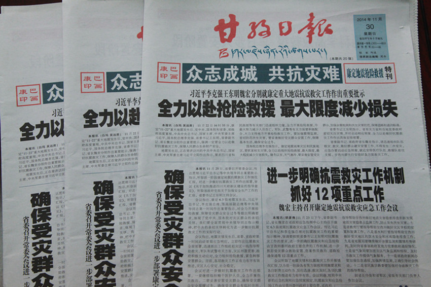 又訊 此外,自康定地震發(fā)生以來(lái),本報(bào)藏漢文報(bào)廣大編采人員發(fā)揚(yáng)連續(xù)作戰(zhàn)的精神,已經(jīng)連續(xù)9天不分白天黑夜地工作,保證了一線有記者的身影,后方編輯及時(shí)發(fā)聲,截止30日,本報(bào)藏漢文報(bào)已經(jīng)出版13期《眾志成城 共抗災(zāi)難》??鸵黄谔乜?,共計(jì)72個(gè)版面;本報(bào)《康巴傳媒網(wǎng)》自開(kāi)辦網(wǎng)站以來(lái),首次實(shí)現(xiàn)了網(wǎng)站信息即時(shí)更新、滾動(dòng)發(fā)布,網(wǎng)站日上稿量超過(guò)100條,日點(diǎn)擊量均超過(guò)10萬(wàn)人次;本報(bào)微信平臺(tái)則采用短平快的方式,第一時(shí)間發(fā)布最新資訊,引導(dǎo)公眾情緒,傳播黨委政府的聲音,微信日點(diǎn)擊和轉(zhuǎn)發(fā)量超過(guò)2萬(wàn)人次;除此之外,本報(bào)承辦的手機(jī)報(bào)也發(fā)揮了巨大的作用。