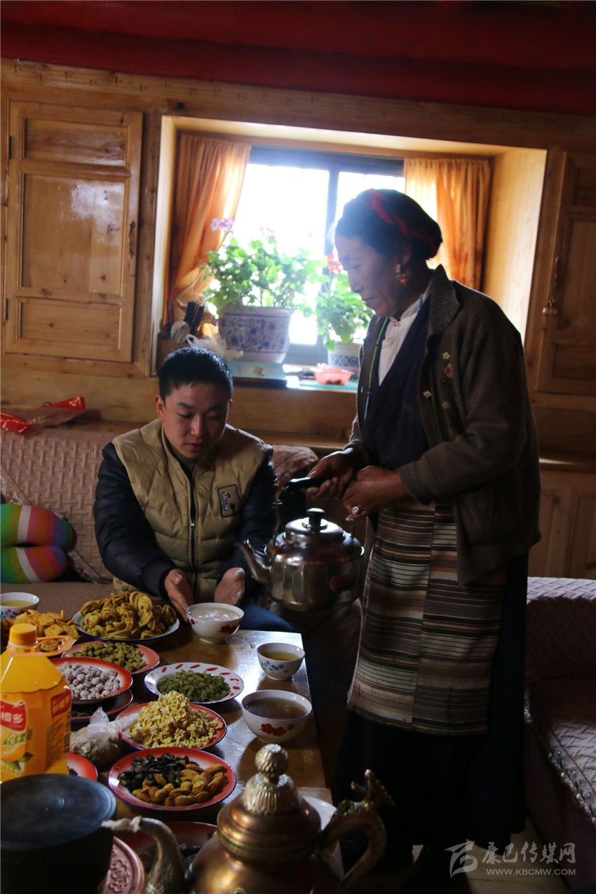 離開合作社,記者一行受邀前往村支部書記澤吉家里做客。汽車在整潔的入戶公路上行駛一陣后,一棟外觀精巧、色彩繽紛的寬大全木質(zhì)民居出現(xiàn)在記者眼前。走進(jìn)客廳,幾張擺滿了各種水果、飲料、干果、糖、酥油果子的藏桌引起了記者的注意,一位十來歲的女孩正在觀看藏歷新年春晚。看到有客上門,澤吉的愛人立刻端來了熱騰騰的酥油茶和黃澄澄的青稞酒。