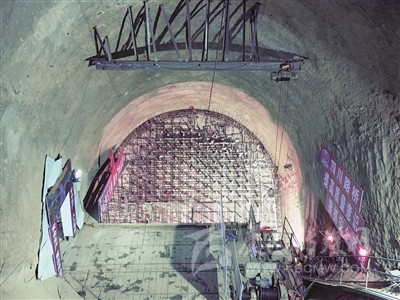 隧道式錨碇建設(shè)運用系列實用型發(fā)明創(chuàng)新,發(fā)掘有利條件,利用瀘定隧道橫洞,采用平移系統(tǒng)安全、高效地轉(zhuǎn)運鋼拉桿;進(jìn)入隧道錨工作區(qū)域后,在洞內(nèi)安裝纜索吊裝系統(tǒng)進(jìn)行鋼拉桿安裝,安裝過程中通過人工配合手拉葫蘆進(jìn)行精確微調(diào),實現(xiàn)了高強(qiáng)度鋼拉桿在狹窄、封閉的錨洞中的轉(zhuǎn)運、安裝和精確定位。