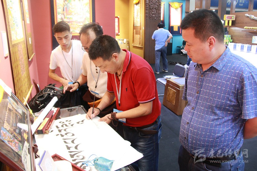 本屆文博會,巴松鄧珠帶來了一件藏文書法作品《格薩爾王》,讓現(xiàn)場觀眾嘖嘖稱贊。孫先生說:“把書法作品用藏族唐卡藝術(shù)的裝裱方式來裝裱,真讓我開了眼界。這件作品圖文并茂,真是太棒了,讓我覺得甘孜這個地方特別神圣,令人向往。我以后有機會不僅要好好練習(xí)藏文書法,還要去甘孜旅游?!?/p>