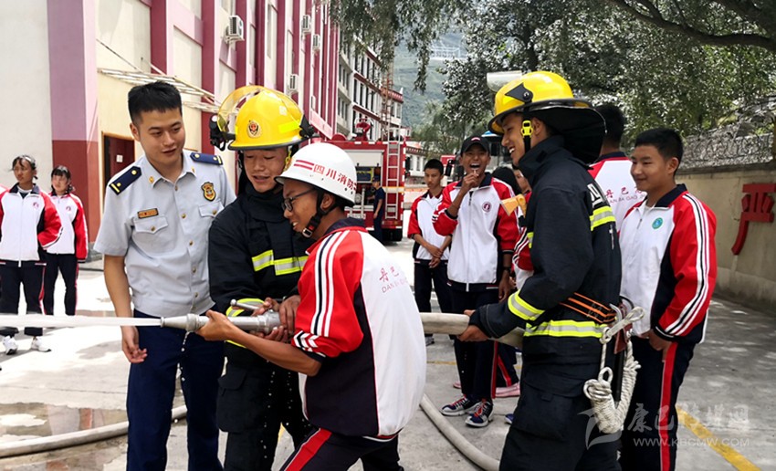 消防隊員指導(dǎo)學(xué)生使用消防器具。