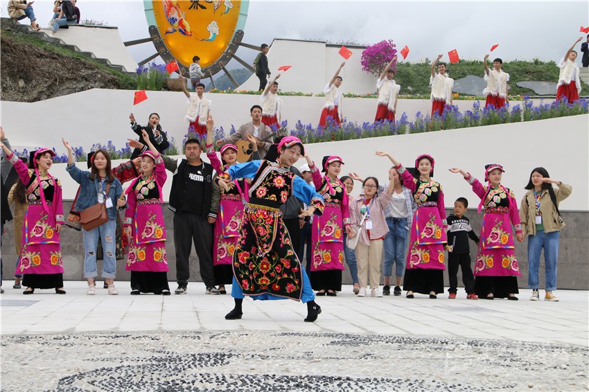 圖為康定市麥崩鄉(xiāng)日央村魚通官寨開(kāi)園儀式上,游客和村民一起表演。