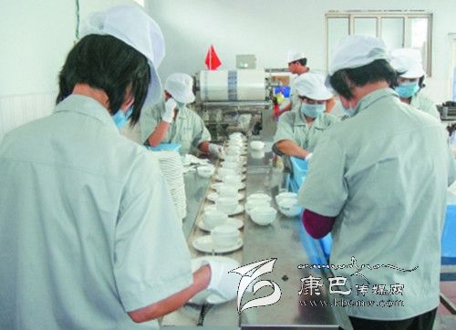 6、包裝。經(jīng)過消毒后的餐具被送到約2米長的綠色傳送帶上,工人先用手把餐具按照包裝要求擺放好。之后送到包裝機器,用包裝膜封口包裝。