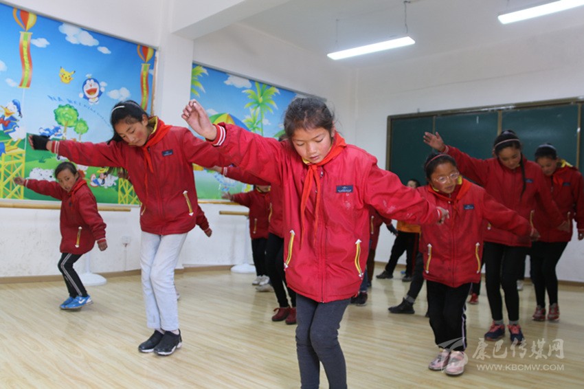 “要跟隨節(jié)拍,注意動(dòng)作協(xié)調(diào)連貫,舞蹈是非常愉悅的享受,要面帶微笑,動(dòng)作不要太僵硬?!痹谖璧甘?,老師正耐心地糾正孩子們的舞蹈動(dòng)作。老師是縣文化館的專(zhuān)業(yè)演員,成為學(xué)校的舞蹈老師后,她就負(fù)責(zé)全校的舞蹈教學(xué)工作。