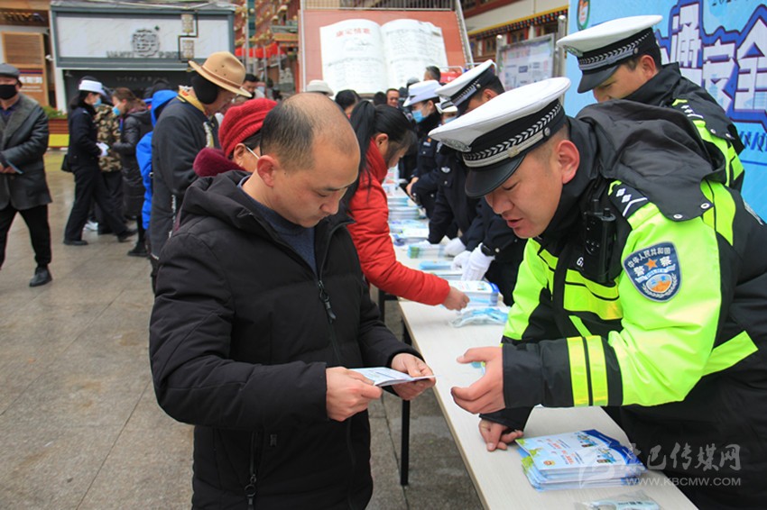 交警在康定情歌廣場(chǎng)開展“一盔一帶”安全宣傳活動(dòng)。