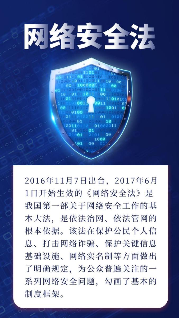 《中華人民共和國網(wǎng)絡安全法》是為保障網(wǎng)絡安全,維護網(wǎng)絡空間主權和國家安全、社會公共利益,保護公民、法人和其他組織的合法權益,促進經(jīng)濟社會信息化健康發(fā)展而制定的法律。《中華人民共和國網(wǎng)絡安全法》由中華人民共和國第十二屆全國人民代表大會常務委員會第二十四次會議于2016年11月7日通過,自2017年6月1日起施行。