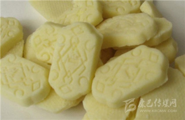 藏族酥酪糕是藏族的著名糕點,在藏族同胞的家里常用作款待客人的美味點心。而且它本身具有很好的保健功效,能夠在品嘗美食的同時又滋補(bǔ)身體。藏族酥酪糕食用起來奶味濃郁,十分受到不同年齡及族群的喜愛,其中還有多種對身體十分有益的材料,例如西藏人參果就是一種純天然無污染的滋補(bǔ)食品。酥酪糕是用提取過奶油后的乳白色淀粉(藏名曲熱)晾干后,用磨磨成粉末,拌入黃油(奶油)、白糖、角麻(人參果)、葡萄干、桃仁等,做成橢圓形、方形,表面有紅絲綠絲擺成圖案,表現(xiàn)吉祥、長壽,放入籠屜內(nèi)蒸熟,賓至可整塊獻(xiàn)上,或切成片狀。據(jù)說它有滋補(bǔ)強(qiáng)身之功效。
